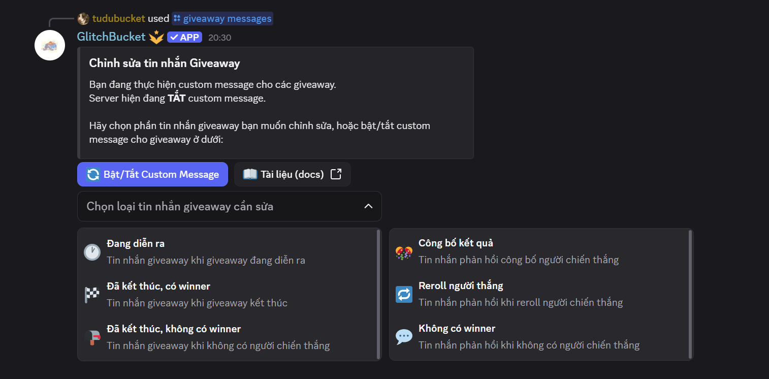 Để setup Custom Message cho giveaway, sử dụng /giveaway messages, sau đó bot sẽ gửi 1 bảng tương tác giúp để custom các tin nhắn như ảnh bên trên.